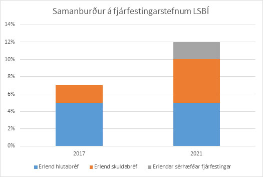 LESA NÁNAREftir að fjármagnshöft voru afnumin árið 2017 hefur Lífeyrissjóður starfsmanna Búnaðarbanka Íslands hf. lagt mikla áherslu á að auka vægi erlendra eigna og breidd í eignasafni og eru erlendar eignir mikilvægur þáttur í áhættudreifingu sjóðsins. Markmið um vægi erlendra eigna í fjárfestingarstefnu sjóðsins hefur hækkað á síðustu árum eins og sést á mynd 1. Þannig hefur markmið sjóðsins í erlendum eignum hækkað úr 7% árið 2017 í 12% árið 2021.