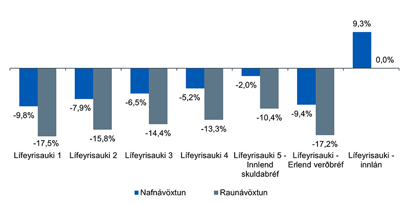 Nafnávöxtun verðtryggðra ríkisskuldabréfa var á bilinu -8,4% til 5,0% á tímabilinu en óverðtryggðra töluvert lakari eða -17,0% til 2,0%. Yfirlýsing fjármálaráðherra í október sl. í tengslum við uppgjör og slit ÍL-sjóðs hafði töluverð áhrif á ávöxtun skuldabréfasafnsins. Bréf ÍL-sjóðs höfðu töluverð áhrif til lækkunar á ávöxtun fjárfestingarleiða Lífeyrisauka fyrir utan Innlán og Erlend verðbréf.
