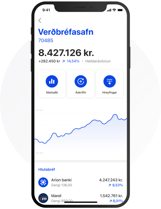 Fyrirtæki og aðrir lögaðilar geta nú átt í verðbréfaviðskiptum með rafrænum hætti, í Arion appi eða netbanka. Í Arion appinu og netbanka er hægt að fylgjast með stöðu eignanna, ávöxtun og sækja hreyfingayfirlit hvenær sem þér hentar.